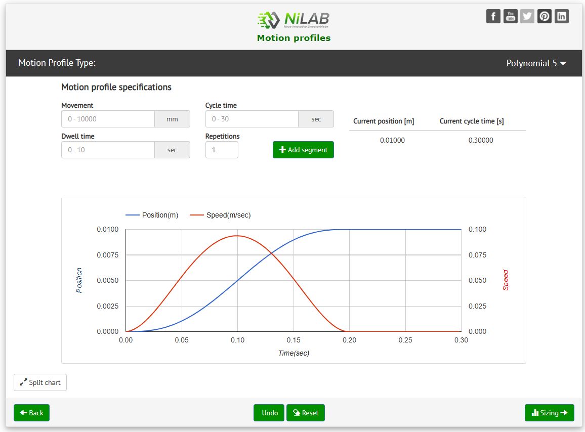 For example, an external payload of 1.2 kgs and a motor type wanted of NL tubular linear motors. Then press Motion Profile button.