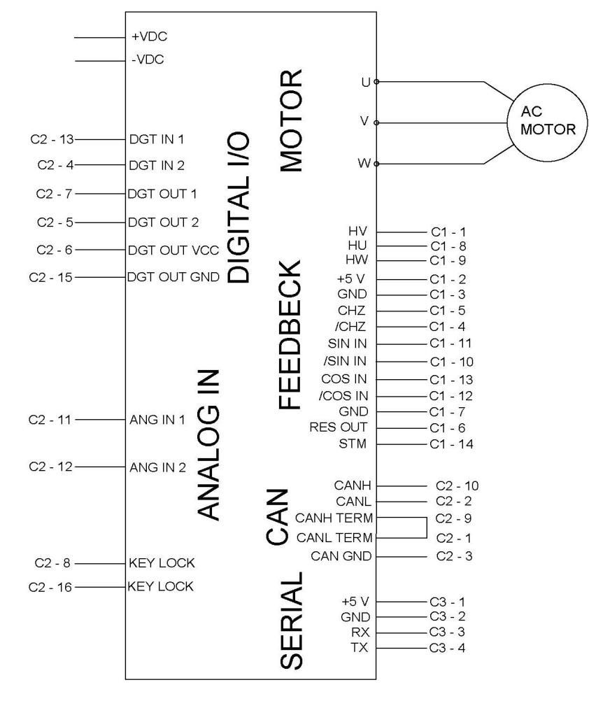 | C2 | 43025-1600 | Molex | 16 poles male, for input/output/can (Receptacle Housing) |