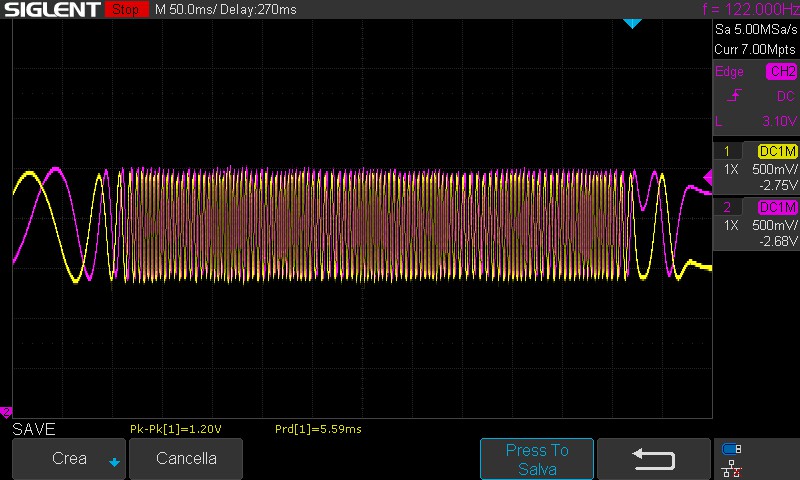 Oscilloscope acquisition of SIN and COS signals (REFCOS and REFSIN are 2.5V constant voltage).