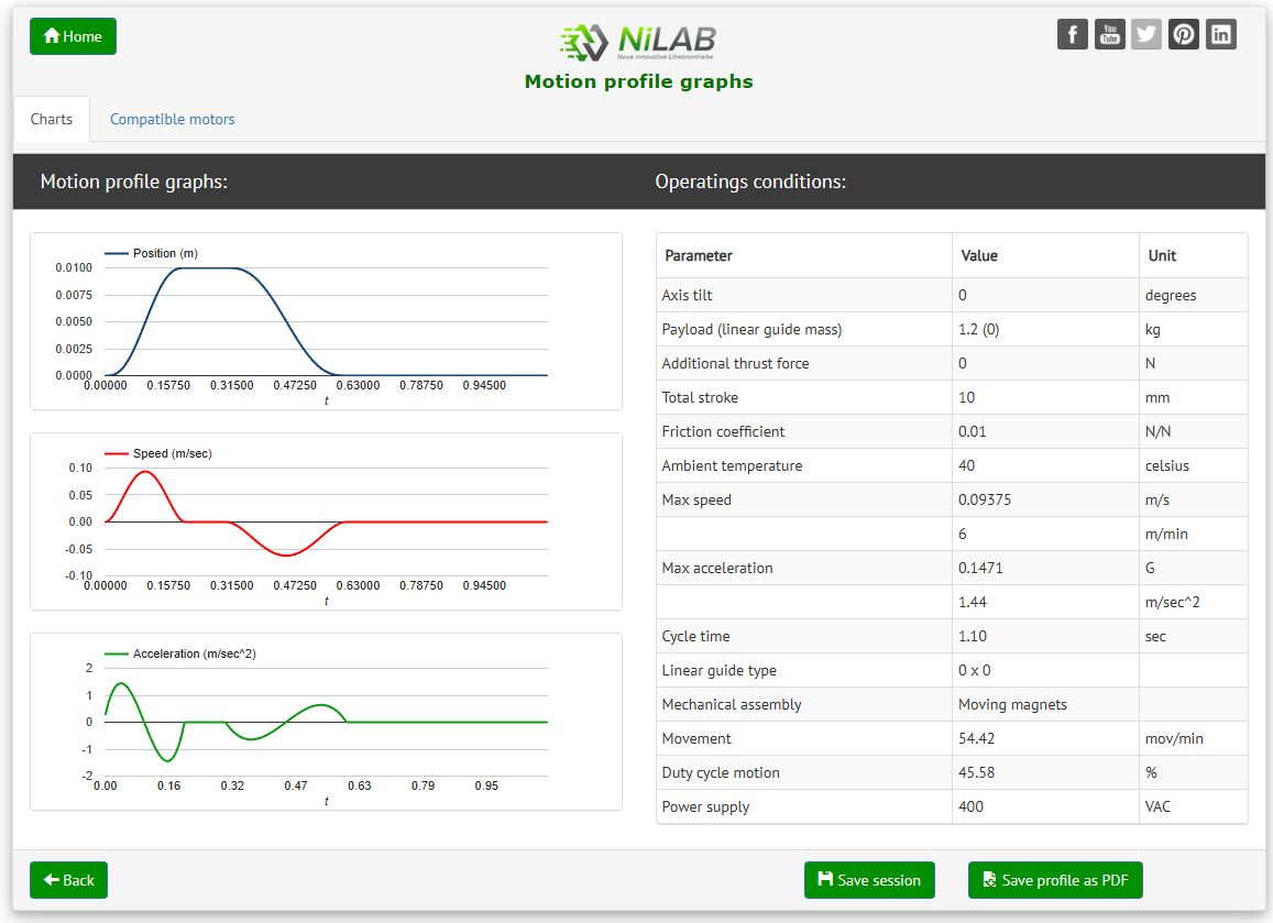 For example, an external payload of 1.2 kgs and a motor type wanted of NL tubular linear motors. Then press Motion Profile button.