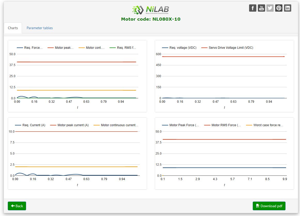 The sizing of linear motors is mainly determined by the application-related characteristics of velocity and feed force. First of all, the user should determine velocity and force profiles for the required application and set the proper parameters about payload, thrust force, ambient temperature and axis tilt. Then, the choice of the motor size is given either by simply calculating its physical limits, or by using a motor sizing application.