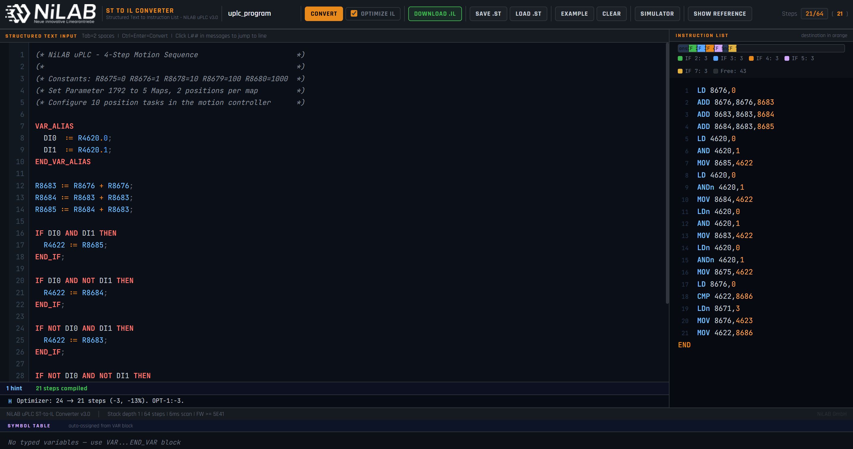 Online tool for programming NiLAB integrated drive motors (NLi family) using IEC 61131-3 Structured Text syntax. The tool compiles ST source code into Instruction List (IL) format compatible with the NiLAB µPLC firmware (>= 5E41).
