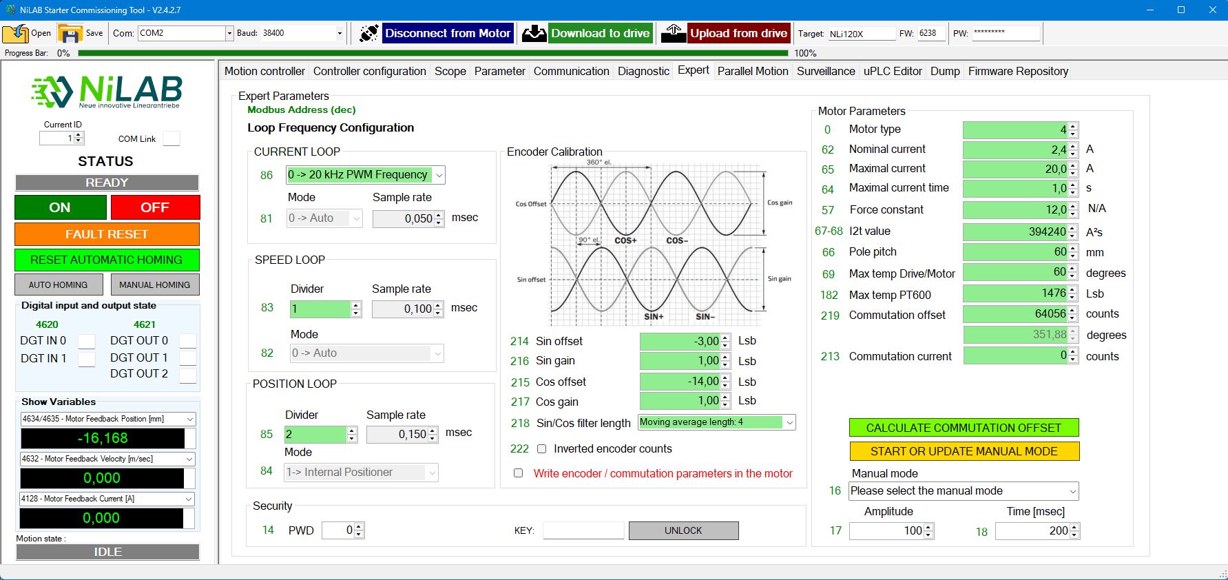 This window provides access for changing the motor parameters and due to the risk to damage the motor is protected by a specific password.