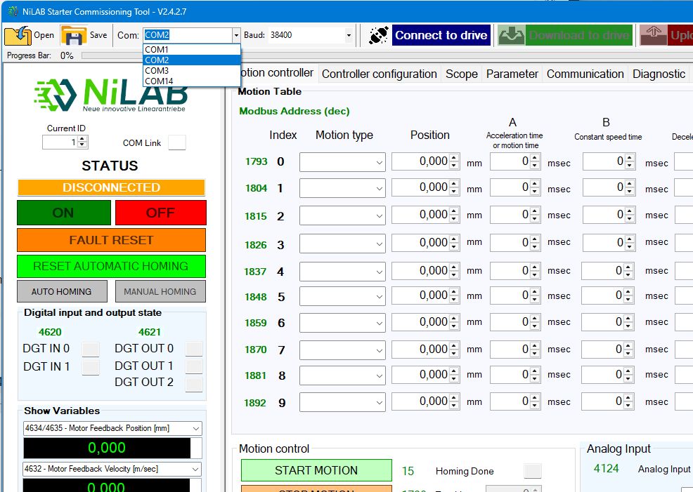 Then, you have to select the right one on the combobox list in the NiLAB Starter Software and then press the button “Connect to Motor”.