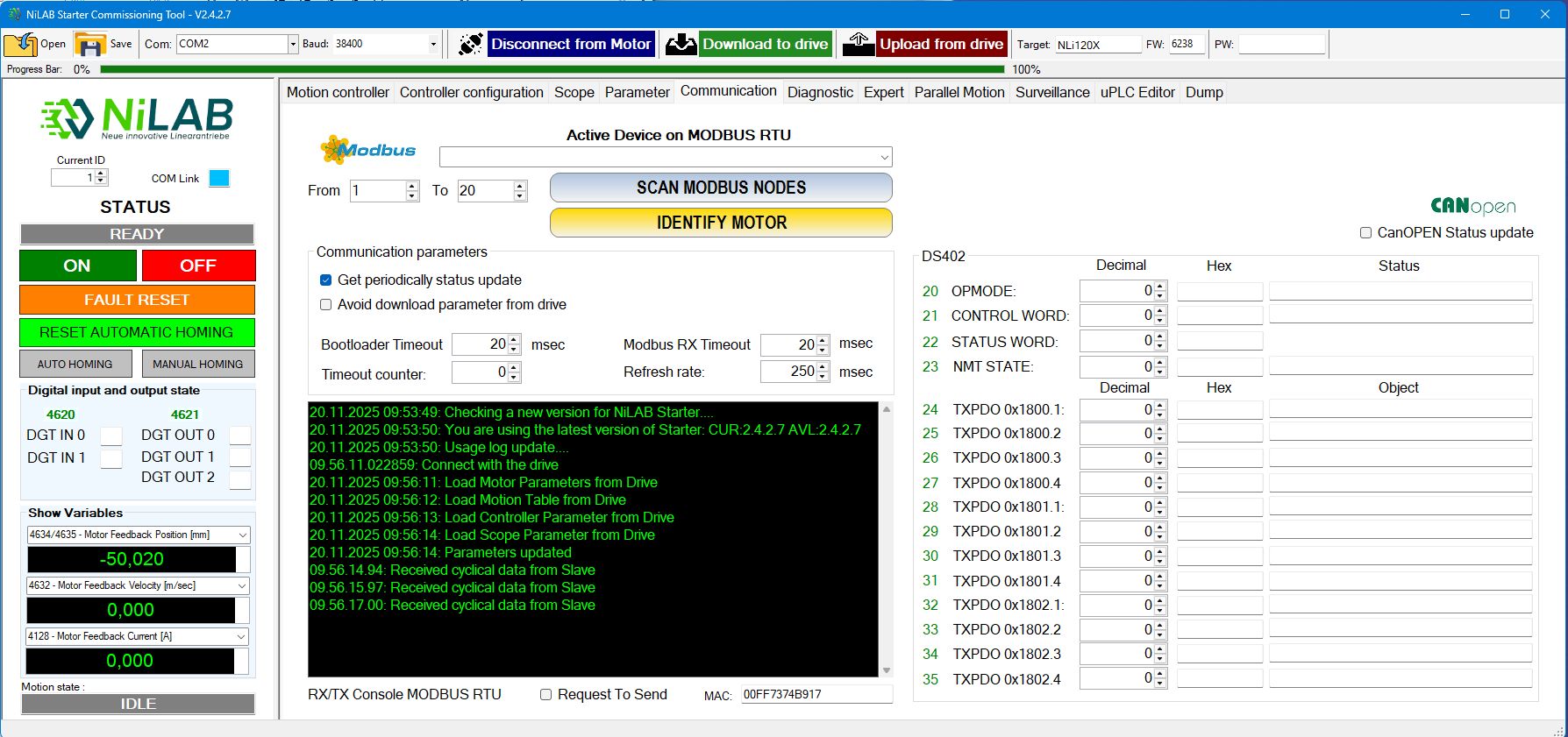 - Button to scan modbus nodes to search the motor actually connected to the MODBUS